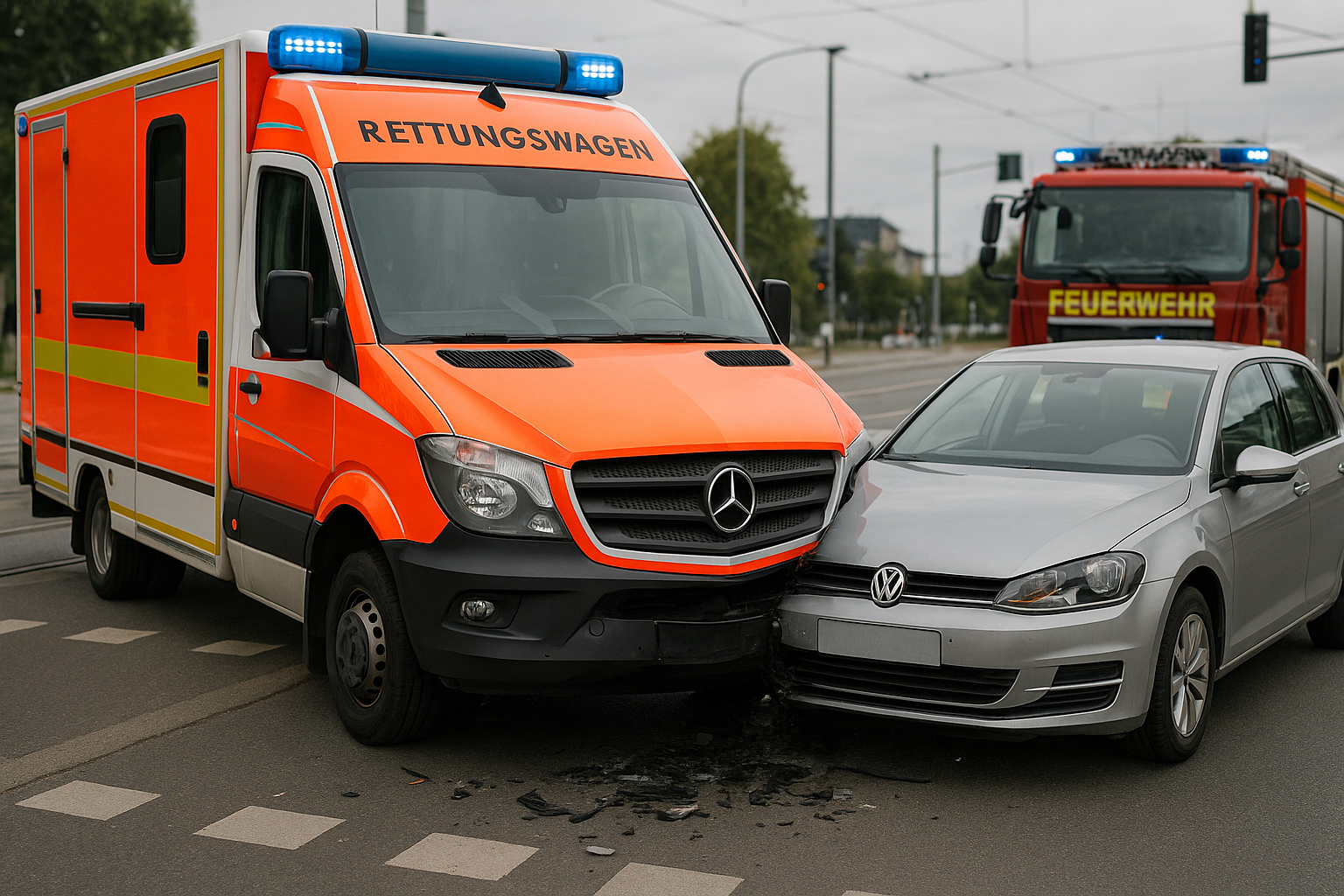 An der Kreuzung Mannheimer Straße/Suezkanalweg kam es zu einem Unfall zwischen einem Rettungswagen auf Einsatzfahrt und einem VW. Zwei Rettungskräfte wurden leicht verletzt.